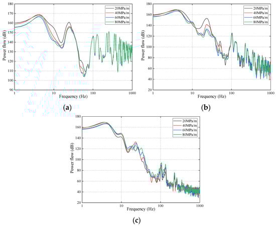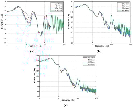 Figure 9 presents the influence of different stiffness levels of the slab mat layer on the power flows. It can be observed from Figure 9a that the changes in the slab mat layer’s stiffness mainly influenced the power flows of the rail below 80 Hz and scarcely affected the power flows above 80 Hz. In addition, the rail’s power flows decreased with increasing slab mat layer stiffness, except for at certain frequencies. Further, the changes from 20 MPa/m to 40 MPa/m are more obvious than those from 60 MPa/m to 80 MPa/m among the frequency ranges of 6 Hz to 28 Hz and 44 Hz to 66 Hz.