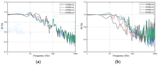 Figure 10 demonstrates the PFTRs of the track–bridge system with different stiffness levels of the slab mat layer. It can be observed from Figure 10a that the PFTRs were all below 1.0 when the vibration energy transferred from the rail to the slab track. In addition, the PFTRs for 20 MPa/m reached maxima at frequencies of 12 Hz to 30 Hz and 37 Hz to 46 Hz, whereas they reached minima at frequencies of 58 Hz to 92 Hz and 160 Hz to 212 Hz. There were few differences in the remaining frequency ranges.