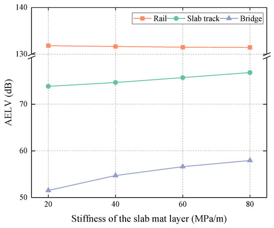 With the running speed of the vehicle set to the typical value of 300 km/h, conditions of the stiffness of the slab mat layer of 20 MPa/m, 40 MPa/m, 60 MPa/m, and 80 MPa/m were included. The influence of the slab mat layer’s stiffness on the vibration energy was thus investigated.