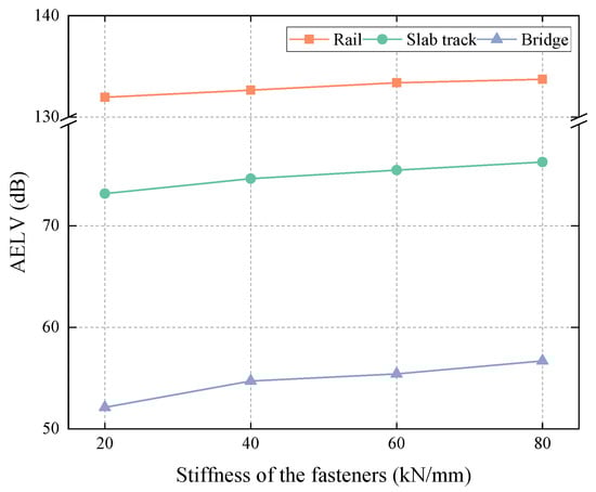 Figure 14 shows the AELVs of the track–bridge system. It can be clearly observed that the AELVs of the track–bridge system all increased as the fasteners’ stiffness rose. In other words, the track–bridge system stores more vibration energy when the fasteners’ stiffness increases. It can be concluded that the AELVs of the track–bridge system are sensitive to changes in the stiffness of the fasteners.