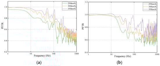 Figure 16 illustrates the track–bridge system’s PFTRs. It can be observed from Figure 16 that the PFTRs were all smaller than 1.0, except for those from the slab track to the bridge at certain frequencies. Further, the PFTRs rose obviously when the running speeds increased at low frequency range, on the whole. Although the differences under different running speeds were small at the high frequency range, it also can be seen that the PFTRs basically increased with increasing running speed. Therefore, it can be said that the PFTRs of the track–bridge system increase with rising running speeds, on the whole.