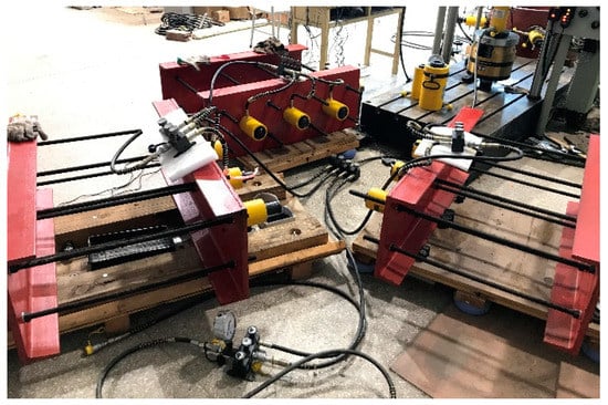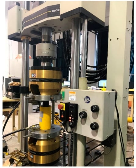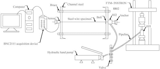 In traditional fatigue tests, the fatigue load is directly applied to only one test specimen at a time through the fatigue testing machine (FTM). When the stress range is low, the test duration is extended. Due to the small size between the two clamps of FTM, it is difficult to place the corrosion box between the clamps. Therefore, the fatigue test of steel wire considering the corrosion factor is difficult to operate. Given the above reasons, in this paper, a new test device was designed, which is able to distribute the oil pressure provided by the FTM to the hydraulic jack (HJ) with a broad range to several HJs with a small range at the same time, to realize the synchronous fatigue loading of multiple wires. The schematic diagram of the device is shown in Figure 3, including FTM-INSTRON 8802, hydraulic jack with a broad range-HJ1 placed between the two clamps of FTM, computer, data acquisition equipment—National Instruments BNC-2111, hollow shaft type annular force sensor—JHBH, fatigue loading device (including 40#C channel steel, braces with a diameter of 20 mm, bolts, multiple hydraulic jacks with small range-HJ2, anchors, multiple steel wires), tubing and diverter valve, hydraulic hand pump with an oil storage capacity of 2700 cc. The FTM is shown in Figure 4. The fatigue loading device is shown in Figure 5.
