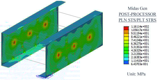 The counterforce frame is made of channel steel. To improve the stability of the whole structure, steel wire goes through the predrilled holes on the channel steel and attached to the two sides of channel steel by using bolts. The counterforce frames and braces share the fatigue load transmitted from HJ1. The maximum tensile force is obtained by multiplying the maximum stress value by the sectional area of steel wire, which can be used to determine the model and size of HJ2. According to the size of the HJ2, the model of channel steel is chosen as 40#C, with a height of 400 mm, flange width of 104 mm and web thickness of 14.5 mm. The commercial software MIDAS GEN is used to build the finite element models of counterforce frames, braces and steel wires. The stress distribution of channel steel is obtained by applying equivalent pressure equal to the maximum tensile force at the end of steel wire. It can be found that the maximum stress of channel steel is higher than its yield strength, so a steel plate of the same material with the thickness of 20 mm is welded at the web of channel steel in order to significantly reduce the stress in channel steel. The finite element model of steel plate is established in MIDAS GEN [24], and eventually, the stress of channel steel is equal to 116 MPa, lower than the yield strength of ordinary carbon steel Q235. The numerical model and stress cloud diagram are shown in Figure 6. The diameters of the braces and wires are taken as 20 mm and 7 mm, respectively.