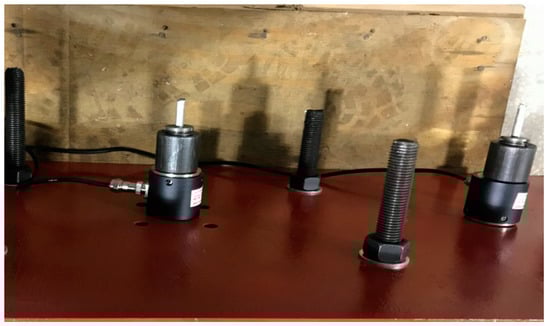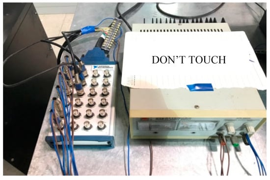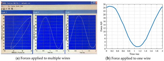 When the hydraulic system is working, the internal particles of the hydraulic oil collide with each other and produce violent friction. Hydraulic oil is also subject to friction resistance when passing through local obstacles. It causes the loss of oil in the oil circuit and the reduction of oil pressure, ultimately consuming the energy of the whole system. For the resistance in the oil circuit, there is an error between the load applied on steel wire and provided by FTM. A force sensor is used to monitor the actual load acting on steel wire and adjust it to the value set by FTM. Considering that the wire is circular, a hollow shaft type annular force sensor, named JHBH, is selected to monitor the fatigue loads, as shown in Figure 7. The working principle of this sensor is to convert the force received by the steel wire into the voltage signal. A data acquisition device, named NATIONAL INSTRUMENTS BNC-2111, is used to collect the voltage signal output from the sensor, as shown in Figure 8. The JHBH is connected to the BNC-2111 by transmission data line, and then to a computer. The computer records and reads the tension in each wire during fatigue loading. LabVIEW programming language [25] is used to calibrate the collected signal, to realize the conversion of the voltage signal to force signal and perform the monitoring and recording of fatigue load. Figure 9 demonstrates the process and working principle of data collection by LabView software, through which force loads applied on each steel wire can be collected synchronously. LabVIEW uses the graphical editing language G to write the program in block diagram form. Figure 10a,b shows the fatigue loads recorded by LabVIEW software, that is, the real-time forces applied to multiple steel wires and one of the wires, respectively.
