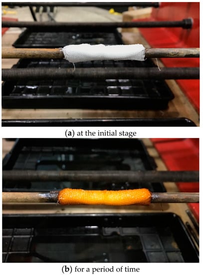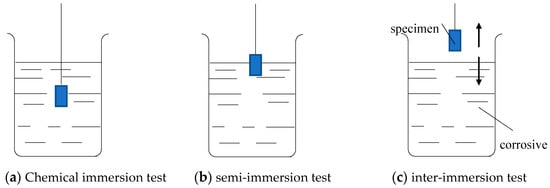 According to the different purpose of the test, the corrosion test in the laboratory includes a chemical immersion test, semi-immersion test, inter-immersion test, etc. As shown in Figure 11, these tests can be used to simulate different corrosion conditions that may be encountered in practical applications. The method used in this paper belongs to the first type of corrosion test [26]. In this method, gauze or cotton is used to wrap the zone where the steel wire needs to be corroded. The corrosive solution is then dropped on the surface of gauze or cotton, and rapidly diffuses in the gauze or cotton to ensure full contact with the wire. Gauze or cotton can not only absorb the corrosive solution and then act on the steel wire, but can also ensure the entry of a certain amount of oxygen and reduce the volatility of the corrosive solution. It is an effective method for corrosion fatigue testing. Through preliminary experiments, it was found that one hour after each drop, the surface humidity of the gauze began to change significantly within an hour, and the moisture in the gauze nearly evaporated after about eight hours. Therefore, to ensure the constant concentration of corrosive solution on the surface of the steel wire, dropping was carried out every 10 min in the test. This interval is the same for all samples. Figure 12 shows the morphology of steel wire subjected to the corrosive solution and fatigue load at the initial stage and during a period of time.