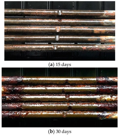The purpose of this paper includes two aspects. One is to investigate the combined effect of corrosive solution and fatigue load on the corrosion fatigue performance of steel wire with a machine-cut notch, and another is to explore the effect of corrosive solution on the fatigue performance. The former uses the method proposed in Section 2.2.4. The surface of the steel wire is coated with cotton gauze, and the corrosive solution with different concentration and pH value is dropped on the cotton. At the same time, the fatigue load is applied on both ends of the steel wire to simulate the combination of corrosive solution and fatigue load. The latter obtains the fatigue life by applying synchronous pulsating fatigue load to steel wire, which has been corroded over 15 days and 30 days, respectively. The morphologies of the steel wire corroded over 15 and 30 days are shown in Figure 13a,b, respectively. The service life is studied by using the test device designed in this paper under the action of synchronous pulsating fatigue load.