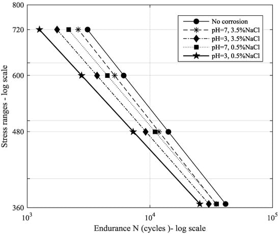 Figure 14 shows the logarithmic S-N curves of the steel wire with machine-cut notch subjected to the fatigue loads and sodium chloride solution, which are the power exponential curves obtained by MATLAB fitting toolbox. The five curves correspond to corrosion free, by sodium chloride at pH value of 7 and concentration of 3.5 wt%, by sodium chloride at pH value of 7 and concentration of 0.5 wt%, by sodium chloride at pH value of 3 and concentration of 3.5 wt%, and by sodium chloride at pH value of 3 and concentration of 0.5 wt%, respectively.