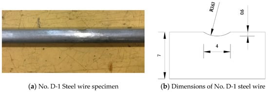 Numerous tests have shown that the initial corrosion pits on the surface of steel wire in old bridge cable caused by chlorine salt are mostly semi-ellipsoidal [21,22], and the non-circular shape can be regarded as equivalent to a circle through simple geometric treatment. The geometric shape of a circular pit can be described by two parameters: depth and width. To simplify the electrochemical process of corrosion pit formation, a machine-cut notch is used to represent an erosion pit caused by chlorine salt. A standard high-strength steel wire sample with a diameter of 7 mm and a tensile strength of 1670 MPa specified in Chinese Specification - GB/T 17101 [23] was selected as the test sample used in this paper, and the length of steel wire was taken to be 1100 mm. The steel grade of high-strength steel wire is S82B, and its chemical composition is shown in Table 1. Zn99.99 is the zinc used in the steel wire galvanized layer, and its chemical composition is shown in Table 2. The fabrication technology processing of steel wire includes pickling, phosphating, drawing, cleaning, hot-dip galvanizing, and stabilization, among which the stabilization process involves the heat treatment process. Domestic Stelmor air-cooled wire rod is used for bridge cables. The hot rolling temperature of austenitization is 950–850 °C, and the quenching temperature of the air-cooled wire used is 620–680 °C. As the heat capacity of air is low, and the thermal stability is weak, the transformation rate of pearlite is not stable during quenching. GB/T 17101 is the specification of hot-dip galvanized steel wire for bridge cables in China, and all information about the chemical composition and fabrication technology processing of steel wire is contained in Section 7.1 of this specification. This specification is generally in line with the requirements of BS ISO 19203:2018, and a description of the steel grade and chemical composition can be obtained from Section 7 of BS ISO 19203:2018. The schematic diagram of defects on the surface of steel wire is shown in Figure 1, and the photo of the steel wire specimen is shown in Figure 2.