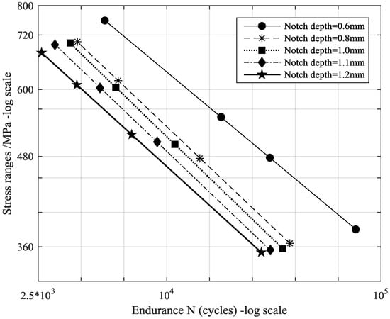 Logarithmic S-N curve of steel wire with semi-ellipsoidal notch of different depth.