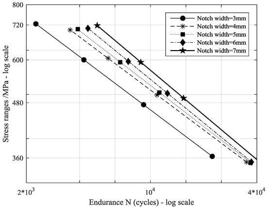 Figure 18 shows the S-N curves of wire life with a machine-cut notch, which are the power exponential curves obtained by MATLAB fitting toolbox. It can be seen that the life of steel wire increases gradually with the increase of notch width. When the stress range is 720 MPa and the width of semi-ellipsoidal notch increases from 3 mm to 7 mm every 1 mm, the life of steel wire increases by 56%, 10%, 14% and 12% respectively. When the stress range is 600 MPa and the width of semi-ellipsoidal notch increases from 3 mm to 7 mm every 1 mm, the life of steel wire increases by 37%, 17%, 11% and 18%, respectively. When the stress range is 480 MPa and the width of the semi-ellipsoidal notch increases from 3 mm to 7 mm every 1 mm, the life of the steel wire increases by 19%, 4%, 11% and 23%, respectively. When the stress range is 360 MPa and the width of the semi-ellipsoidal notch increases from 3 mm to 7 mm every 1mm, the life of the steel wire increases by 56%, 6%, 1% and 8%, respectively. It can be seen that when the stress range is higher, the life of the steel wire is lower, and the change rate of life is lower when the notch width is 4–6 mm. The growth rate of wire life is highest and by more than 20% when the width of the defect increases from 3 mm to 4 mm.