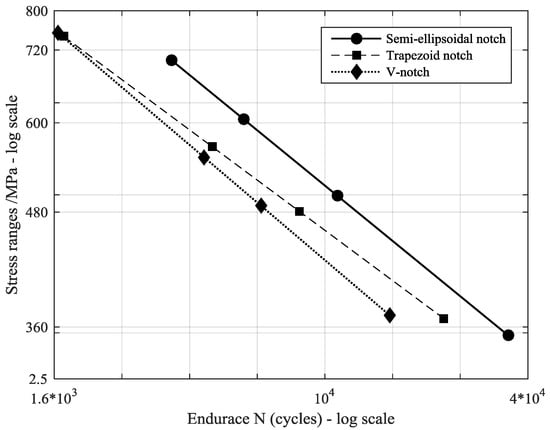 Logarithmic S-N curve of steel wire with different notches of different shapes.