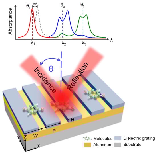 Figure 1 illustrates a schematic view of the proposed surface-enhanced infrared sensor employing angle-tunable narrowband absorber, where a patterned dielectric grating strips array is resting on a thick metal (aluminum) film. The material of the dielectric grating can be CaF2, which has no substrate phonon effect in the considered infrared regime, and the material of the substrate is Si. Here, aluminum is used because the small absorption coefficient that leads to a narrower absorption as compared to gold and silver [32]. As a transverse magnetic (TM) polarized light irradiates upon the metasurface with an angle of θ (0° ≤ θ < 90°), dielectric guide mode resonance can be excited at the resonant wavelength, and the energy stored in the excited guided-mode resonance is efficiently absorbed by the metal layer, yielding a peak in the absorption spectra. Such a resonant peak is sensitive to the refractive index change around the dielectric grating. The refractive index change of surrounding analytes would induce a wavelength shift (△λ) in the absorption spectrum, which enables us to detect the refractive index of the surrounding analytes, as shown in the schematic diagram in Figure 1. Moreover, this resonant peak also can be tuned (from λ1 toλ3) to overlap with the molecular vibrational mode by adjusting the incidence angle (from θ1 to θ3), so as to selectively identify the vibrational mode of analyte. The combination of these features exhibits great potential application of our device for the infrared refractive index sensing and surface-enhanced infrared absorption spectroscopy in a single substrate.