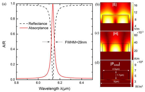 Figure 2. (a) Absorption and reflection spectra of the absorber. The parameters of the dielectric grating strips are P = 5 μm, W = 4.3 μm, H = 1.7 μm; (b) Electric field distribution; (c) Magnetic field distribution; and, (d) Power loss distribution of the absorber at resonant wavelength of 6.134 μm.