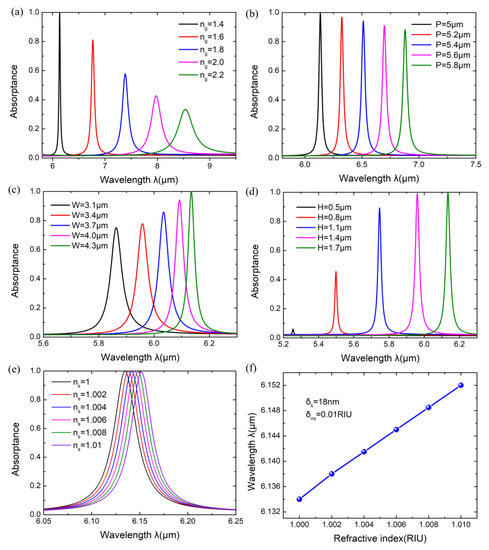 Figure 3. (a) Absorption spectra of the absorber with varying RI (ng) of dielectric grating strips. (b) Absorption spectra with varying P when W = 4.3 μm and H = 1.7μm. (c) Absorption spectra with varying W when P = 5 μm and H = 1.7 μm. (d) Absorption spectra with varying H when P = 5μm and W = 4.3 μm. (e) Absorption spectra with different refractive index of the surrounding environment (ns). (f) Resonant wavelength plotted as a function of refractive index ns. The parameters of the dielectric grating strips are P = 5 μm, W = 4.3 μm, H = 1.7 μm, ng = 1.4.