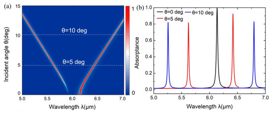 Figure 4. (a) Absorptance map of the dielectric-metal metasurface absorber with different incident angle. (b) The absorptance spectra with varying incident angle when θ = 0 deg, θ = 5 deg and θ = 10 deg.