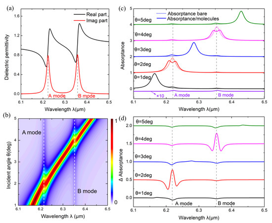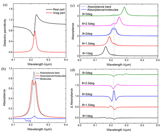 Figure 6. (a) The dielectric permittivity of the molecular film with two vibrational modes at 6.225 μm and 6.355 μm when NA = NB = 0.1 mol m−3, γA = γB = 8 × 1011 rad/s. (b) Absorptance map of the dielectric-metal absorber covered with molecules film with different incident angle. (c) Absorption spectra of absorber covered with and without molecules film in different incident angle. (d) Delta absorptance of absorber covered with molecules film in different incident angle.