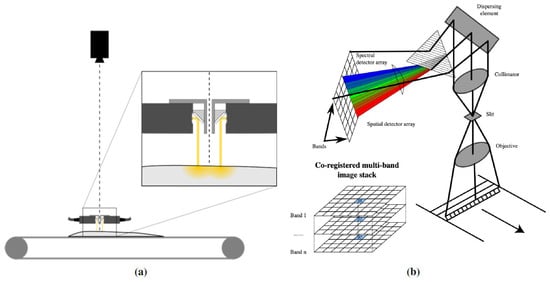 (a) The HSI setup with the Hyperspectral camera. © NOFIMA, Norway. (b) The HSI linear push-broom array. © https://commons.wikimedia.org/wiki/User:Arbeck.