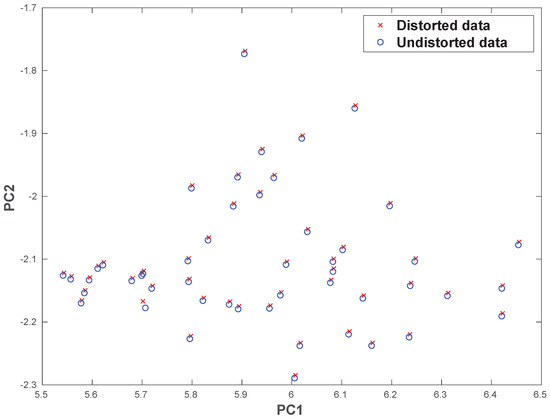 Plot of the first two principal components (PC) of the original mole spectral signatures (blue) and the spectral signatures of the distorted data (red) (see Figure 1b). Note the complete overlap of the two data sets, save for a small change at around (PC1, PC2) = (5.7, −2.2).