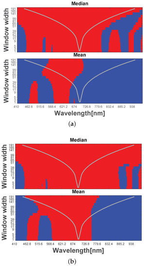 The core method of this paper is to test simultaneously for many different scales and positions (frequency bands). The scale s equals the number of different frequency bands being summed across. To be specific, this means that scale corresponds to the situation where we test if the observed values at spectral frequency d are different between acquisitions of spectral signatures. At scale and position d, a smoothing in terms of a weighted average of the observed values for spectral frequencies , d and are used to test whether the acquisitions are different. The weights are calculated from an Epanechnikov kernel function (i.e., parabolic function) [10], the same as in [7]. For other scales, completely analogous smoothing over the frequency bands are made and used to perform the tests. Note that by applying this smoothing, we are able to test for differences in the acquisitions at all locations for a large number of scales. In fact, the tests are performed at all p spectral frequencies for a total number of different scales. Instead of looking at a single location or a single scale, the described scale-space approach can help detect changes that appear at several levels of smoothing, i.e., resolution.