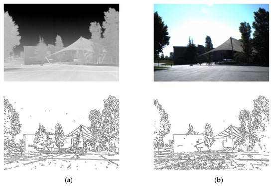 Consistent edges of infrared and visible images are extracted by selecting the long edges of images. First, due to the intense difference between infrared and visible images, a white balance method is utilized to handle infrared and visible images so that they all occupy the maximal possible range [0,255] [37]. Second, histogram equalization is used to enhance the edges of infrared and visible images [38]. Third, the Canny method [39] is used to extract image edges. The key idea of Canny is to use two different thresholds in order to determine which point should belong to an edge: a low threshold T1 and a high threshold T2. Points with a gradient greater than T2 are edge points. Points with a gradient greater than T1 and less than T2 are edge points if there is a continuous path linking those points to the points with a gradient greater than T2. In this paper, the modified Canny method [40] is adopted. The high and low thresholds of the Canny method are set automatically. The detection procedure of the modified Canny method incorporates the same steps as the original Canny method except that T2 and T1 are set locally. Thresholds (T2, T1) are determined within a moving window centered on the current pixel. Following the setups used in Reference [40], the window size is chosen to be 20 × 20. T2 is set to the gradient magnitude that is ranked as the top 30% in the window and T1 is set to 40% of T2 [40]. The set of the extracted edge is denoted as E = {e1,e2,…,eM} where M is the number of edges. Lastly, the edge length is calculated by the contour search algorithm [38]. As a result, an edge is denoted as ei = {p1,p2,…,pli} where p is the edge point and li is the edge length. Consistent edges are generated by selecting edges that are longer than α. The set of consistent edges is denoted as le = {ei| |ei|>α, ei∈E}.