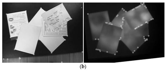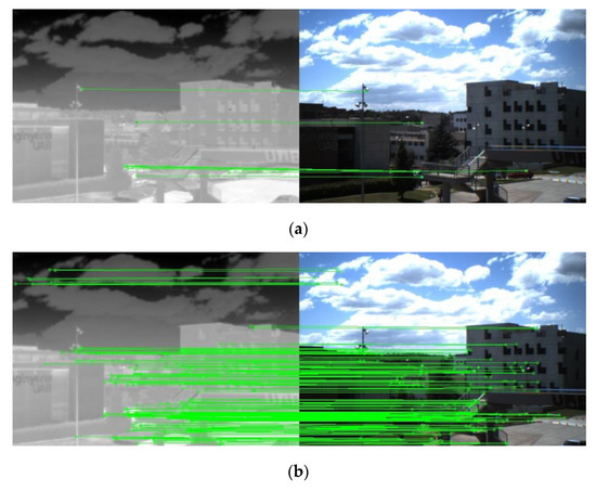 An example of common feature point detection is shown in Figure 2. As shown in Figure 2a, the feature points generated by the text on the visible image have no corresponding points on the infrared image. As a result, these feature points are non-common feature points. Matching of these feature points can only get the wrong matches. The feature points extracted by the common feature point detection method are shown in Figure 2b. The number of feature points extracted on the text of visible images is reduced significantly when compared to Figure 2a. The common feature point detection method can improve the matching performance by removing non-common feature points.
