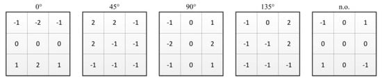 (2) The edge orientation is used to describe the edge information in the neighborhood. During the calculation of the edge orientation, the inconsistent short edges formed by local details are ignored and the consistent long edges formed by global structures are considered. The calculation of the edge orientation is performed by 0°, 45°, 90°, 135°, and non-directional (n.o.) Sobel filters, which are shown in Figure 3 [28]. The edge orientation is calculated for each point p of consistent edges in the neighborhood. The edge orientation of the point p is the orientation of the Sobel filter corresponding to the maximum response value. Let symbols fi, i = 1, 2, 3, 4, 5 denote 0°, 45°, 90°, 135°, and n.o. Sobel filters. The orientation b of the point p can be formulated by the equation below.