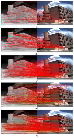 RANSAC estimation is used to evaluate the matching performance of LGHD and DDCE. The performance of RANSAC estimation depends on both the percentage and the number of correct matches [44]. A group of experimental results of LGHD and DDCE is illustrated in Figure 6. It can be found that LGHD achieves a small number of correct matches, as presented in Table 5. As shown in Figure 6a, the experimental result of LGHD contains wrong matches indicated by non-horizontal lines. In addition, the building that is the main scene of infrared and visible images is missing. As shown in Figure 6b, however, DDCE successfully identifies the building as indicated by horizontal lines. Although LGHD achieves a slightly higher percentage of correct matches than DDCE, DDCE obtains a significantly larger number of correct matches than LGHD, which leads to a better RANSAC estimation performance by DDCE.