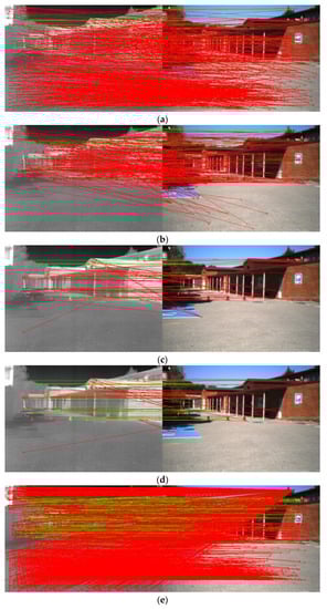 Figure 4 shows the matching results of SIFT, ORB, LIFT, SuperPoint, and DDCE on a pair of infrared and visible images successively. In Figure 4, red lines indicate the wrong matches and green lines indicate correct matches. To make the matching results easier to see, the number and the percentage of correct matches of each method shown in Figure 4 are listed in Table 3.