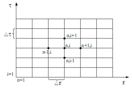 For Formula (1), the spatial diffusion term and the temperature instability term in time . One-dimensional unsteady heat conduction in the time–space region can be discretized according to Figure 1.