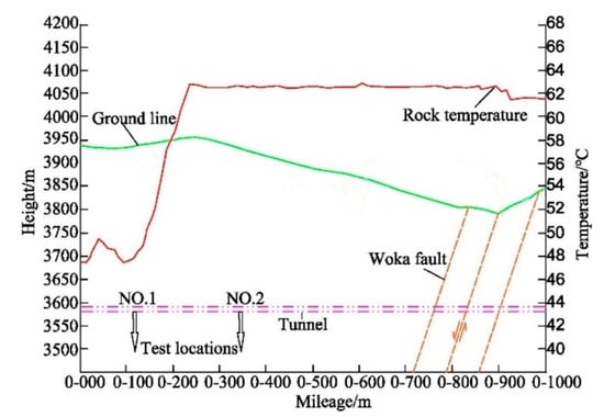 The Sang Zhu Ling tunnel, selected for this study, is a single-track railway tunnel with a total length of approximately 16,449 m. Its maximum overburden is approximately 1480 m. It is located near the Woka garben. Hot spring water and vapor coming from deep in the crust fill the rock cracks and exchange heat with the rock, which causes a rise in the rock temperature, resulting in a highly active geothermal phenomenon. The maximum rock temperature measured in the bore holes is over 89.9 °C, which is the highest temperature of rock on record in a railway tunnel area (Figure 3). From the results of the advanced geothermal detection (before construction) in the experimental region (within one kilometer), the initial rock temperature distribution ranged from 46 to 63 °C along the tunnel line. Based on the field environment conditions, two test locations (NO.1 and NO.2), of which the initial rock temperatures were 47 and 62 °C, were selected for the field test on both surrounding rock temperature and lining temperature (Figure 4).