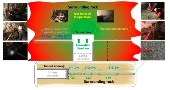 The rock temperature was measured with embedded temperature sensors in the rock hole. As in Figure 5, each hole was excavated by a drilling machine at two sides of the tunnel wall near the test location and each one was 24 m deep and the hole diameter is 0.22 m. In order to get the variation characteristics of the surrounding rock temperature in the radial direction of the tunnel, the angle between drilling direction and excavation direction is set at 0°. The average of the two test holes’ values was taken as the final results of each test location. The temperature sensors were fixed on the test rod and the closer to the tunnel sidewall, the larger the number of temperature sensors were. Finally, the binary slurry was used to grout and seal the heat conducted channel so as to conform to the characteristics of the thermal conduction of the surrounding rock solids. During the construction process, the change in rock temperature with time was recorded by a TST-3826 automatic acquisition instrument during the excavation of the tunnel.