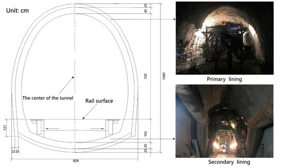 The test cross-section was 8.26 m wide and 10.60 m high, as shown in Figure 6. Five temperature sensors, which were located at the left wall, the left arch, the vault, the right arch and the right wall, respectively, were attached to each test section in the primary lining. Similarly, two temperature sensors were also installed at the left wall and right wall of the secondary lining. The layout of the measuring point was shown in Figure 7. The acquisition device was a hand-held vibrating strain collector and long-term monitoring was conducted after the installation of the temperature sensors. At the same time, the air temperatures of two test locations were also measured with a hand-held hygrothermograph.