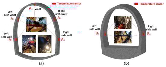 Layout of temperature monitoring points in lining structure: (a) primary lining and (b) secondary lining.