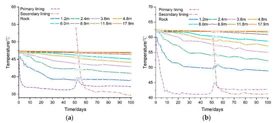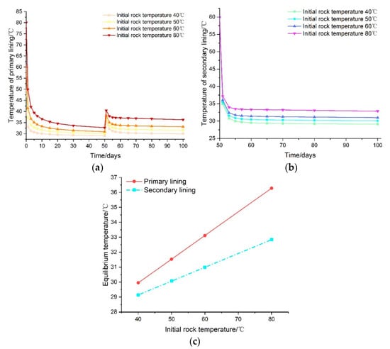 Similarly, the condition of initial rock temperature in the prediction model was set as 40 °C, 50 °C, 60 °C and 80 °C, and the other conditions presented in Section 3 were used. As shown in Figure 8, the initial temperature of the lining concrete decreased from a high level and showed a rapid decline rate within seven days. The initial rock temperature has no significant influence on the time of the rapid temperature decline of the primary lining. When the temperature becomes stable, the higher the initial rock temperature and the higher the lining temperature. The stable temperature of the primary lining ranges from 30 to 36 °C while the secondary lining is from 29 to 33 °C. The temperature of primary lining has risen by 6.8–7.7 °C after the completion of the secondary lining in several days and the stable temperature of primary lining is 3.4 °C higher at most than that of the secondary lining after 100 days.