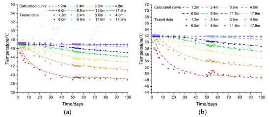 However, compared with the test results, the calculated curve deviates from the upside of the experimental curve, but the deviation is small. The difference between tested and calculated results became smaller within the next few weeks. A major reason for this was that in the first few days, tested sections were close to the construction work surface. More cooling measures were taken such as sprinkling water and placing ice cubes to protect the personnel and machinery safety from heat damage. As the working face of the tunnel continued to advance, the heat transfer state of rock and air returned to normal. Nevertheless, the air temperature inside the tunnel was thought of as a constant average value in the prediction model. Moreover, due to the significant effect of cooling measurements on the large temperature difference of the environment, the higher the initial rock temperature, the greater the difference between tested and calculated results.