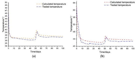 Test Locations 1 and 2 were chosen to compare tested results and calculated results of temperature, as shown in Figure 9. It can be revealed that the temperature of the surrounding rock decreased with time. The closer to the side wall, the greater the temperature dropped. The calculated results also reflected the slight rising of rock temperature near the tunnel sidewall after the accomplishment of the secondary lining construction, especially in Test Location 2. The change laws of temperature are consistent with the experimental curve to some extent.