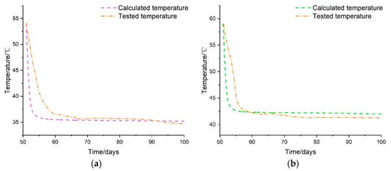 As for the temperature of lining structure, it can be seen in Figure 7 and Figure 8 that the temperature distribution of the primary lining was in the range from 37.2 to 46.5 °C and 42.8 to 61.3 °C, respectively, while the variation ranges of the secondary lining are 35.1–54.1 °C and 41.3–59.8 °C. Moreover, it appears that there is a temperature rise of 2–3 °C in the primary lining after the accomplishment of the secondary lining construction. The initial temperature of the concrete decreased from a high level and showed a rapid decline rate within seven days. After almost one week, the decline rate slowed down noticeably at first and then gradually stabilized. It is noticeable, however, that the final temperature of the concrete lining was a little lower than the rock temperature and the temperature of primary lining was a little higher than that of the secondary lining because of heat dissipation at the free face.