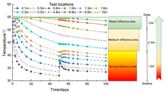The change law of the surrounding rock temperature field was proven to be basically the same by the calculation of heat transfer and temperature change under different initial rock temperature conditions. Moreover, all the temperature change results under different conditions were taken into consideration and summarized. Taking the initial ground temperature at 55 °C as an example, the variation of the surrounding rock temperature with time at different depths away from the side wall is shown in Figure 12. The decrease of rock temperature near the tunnel sidewall was faster in the first 14 days and then became slower gradually. However, the surrounding rock far away from the tunnel sidewall had no obvious change in temperature. Overall, the rock temperature around the tunnel showed three ways of change and they are corresponding to the three influence areas.