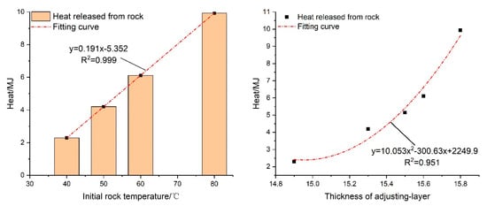 As we all know, the heat released by radial surrounding rock mostly depends on the high-temperature rock that is in the range of the heat-adjusting layer. Based on the analysis of the above results and heat transfer theory, the tunnel construction under different initial rock temperature conditions gives off different amounts of heat. As shown in Figure 14, the heat released by the rock is part of the heat source in a high geothermal tunnel. When the temperature is from 40 to 80 °C, the accumulated amount of heat released ranged from 2.29 to 9.93 MJ, and it increased linearly with initial rock temperature in 50 days. What was more, the released heat from rock increased, appearing slowly first and fast afterwards, with the thickness of the adjusting layer. The final calculation results may provide basic data for the design of ventilation and a comprehensive cooling system.