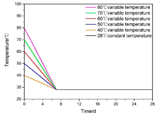 Therefore, according to the field tests and calculation results on the concrete temperature, a new model for concrete curing was proposed, which can really reflect the curing process of concrete in high geothermal tunnels. The curing temperature started from the initial high-temperature T1. In the first seven days, the curing temperature was set to decrease at the same rate before it reached 34 °C on the seventh day. During the period from the 8th to the 28th day, the curing temperature kept constant at 34 °C (Figure 16). During the entire curing process, the humidity in the test maintained a certain level.