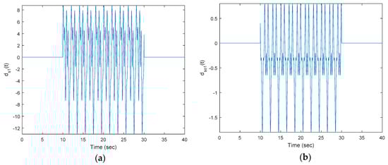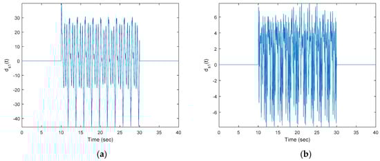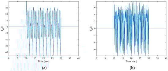Second, Figure 5 shows the input disturbance (state-dependent disturbance inside) and the pure non-linear state-dependent disturbance. Here, is slightly different from the optimal OKID-based LQAT without the EID estimator, because the differences between the two states are induced by different controllers. Next, the robustness of the optimal OKID-based LQAT integrated with the functional observer-based EID estimator is shown in Figure 6a,b. Also, Figure 7 plots the control inputs corresponding to the proposed approach. Notice that for this square system, where A comparison with Figure 4 shows that the proposed approach (Figure 6) significantly improves the tracking errors of the noisy singular system.