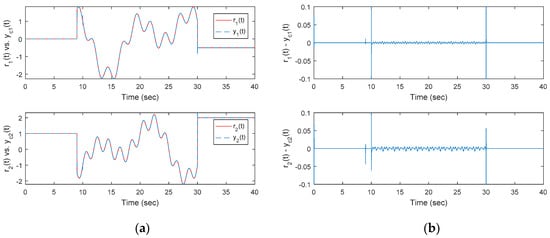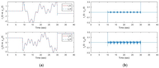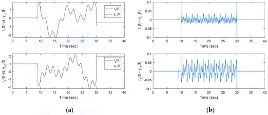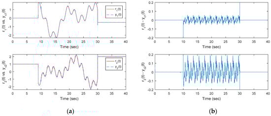 First, Figure 8a plots the time responses of the non-square system and Figure 8b shows the output tracking errors under the control action of the traditional optimal OKID-based tracker without an EID estimator. It can be concluded that the proposed method gives significantly improved performance compared to the traditional approach.