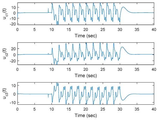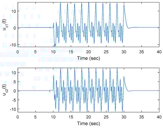 Second, the robustness of the optimal OKID-based LQAT integrated with the modified functional observer-based EID estimator is shown in Figure 9a,b. Additionally, Figure 10 plots the control inputs corresponding to the proposed approach. Notice that for this non-square system. A comparison with Figure 8 shows that the tracking errors for the perturbed singular system are significantly reduced.