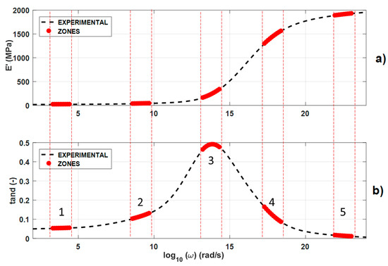 In the previous section, it has been demonstrated that the FDGM is an analytical model able to fit the real viscoelastic behavior with the minimum necessary number of parameters. Furthermore, the pole-zero formulation ensures a robust and fast parameter identification process starting from the experimental data of moduli in the frequency domain. Hence, the question arises about the minimum number of experimental data needed to reproduce the materials’ behavior in a wide frequency range. To carry out this study, five frequency zones have been identified in the range in which the storage modulus and the loss tangent were defined for compound A, as depicted in
