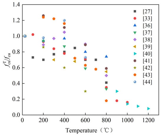 The residual compressive properties of concrete exposed to elevated temperatures are particularly important not only for the fire protection design of the structure, but also for the evaluation and repair of the structure. A considerable number of experimental studies regarding the residual compressive strength of SFRC have been conducted. Some experimental data regarding the residual compressive strength of SFRC are presented in Figure 1. As shown, the relationship between the maximum exposure temperature and the residual compressive strength can be classified into three different stages:(1) In the primary stage, the residual compressive strength of SFRC decreased slightly and may even increase slightly as the high temperature caused the cement hydration reaction to occur more fully when the temperature range was between the room temperature and 400 °C. (2) In the second stage, the residual compressive strength of SFRC decreased significantly as the temperature increased from 400 to 800 °C. (3) In the final stage, the residual compressive strength of SFRC was almost completely lost when the temperature was beyond 800 °C.