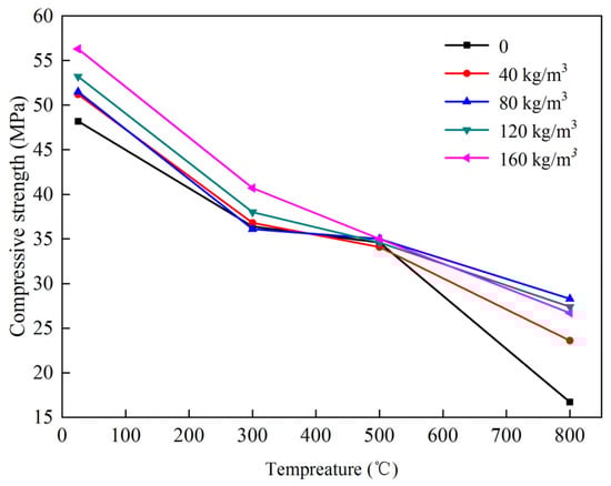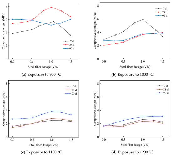 The residual compressive strength of concrete is affected by the volume content of steel fibers. Chen et al. [39] observed the variation law of residual compressive strength of samples prepared with different steel fiber contents (0, 40, 80, 120, and 160 kg/m3) at different maximum temperatures through experiments. As illustrated in Figure 2, with the increase in steel fiber dosage, the residual compressive strength of SFRC increased between the room temperature and 300 °C. However, from 500 to 800 °C, when the steel fiber content was less than 80 kg/m3, the compressive strength of SFRC increased with the steel fiber content; furthermore, when the steel fiber dosage continued increasing to 160 kg/m3, the compressive strength of SFRC decreased with the increase in steel fiber dosage. This changing trend is supported by the conclusion of Zheng et al. [27,48]. When the concrete was exposed to a temperature beyond 900 °C, the variation trend of the residual compressive strength of SFRC as shown in Figure 3, showing that when the steel fiber content is less than 1%, the residual compressive strength of SFRC increases with the steel fiber content; however, when the steel fiber content surpasses 1%, the residual compressive strength decreases with the increase in steel fiber dosage, and the age of concrete exerted little effect on this trend [40]. When the temperature increased beyond 500 °C, the effect of the steel fibers began to become more significant; however, a higher steel fiber content caused coagulation in the steel fibers, resulting in reduced usable area. Moreover, a greater thermal expansion between the cement and steel fiber generated more cracks, which was considered to be the reason for the decrease in the compressive strength of concrete with the increase in steel fiber dosage [27,40]. In addition, Scheinherrová et al. [49] discovered that the residual compressive behavior of concrete exposed to high temperatures was affected by the type of steel fiber coating. Under high temperatures, the compressive strength of reactive powder concrete with Cu–Zn-coated steel fibers was significantly higher than that reported in [43].
