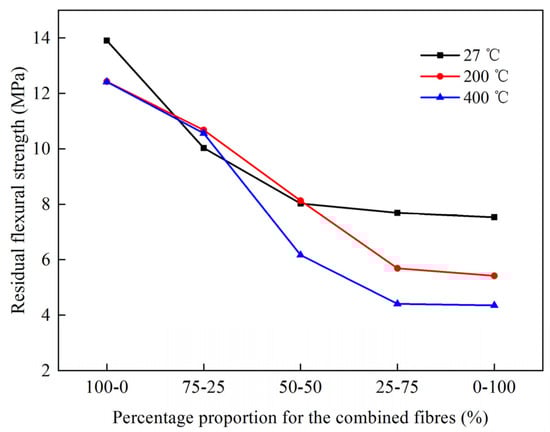 Studies regarding the residual flexural properties of SFRC are limited. The flexural testing of SFRC has been performed on prisms, but the specimen sizes used previously varied because of the lack of standardized test specifications, including 150 mm × 150 mm × 550 mm [56], 150 mm × 150 mm × 600 mm [25], 100 mm × 100 mm × 400 mm [33], and 100 mm × 100 mm × 500 mm [57]. Lau and Anson [33] concluded that the flexural properties of concrete reinforced with 1% steel fiber were better than those of concrete without steel fiber when the maximum exposure temperature ranged from 105 to 800 °C. However, non-fiber mixtures and SFRC differed in terms of residual flexural strength when the mixtures were exposed to temperatures beyond 800 °C. This may be due to the steel fibers, which provided a considerable degree of ductility when concrete was heated below 800 °C. However, as the temperature increased further, the mechanical properties of the steel fibers appeared to be degraded owing to oxidation and corrosion [58,59], resulting in insufficient ductility. The residual flexural strength of different fiber-reinforced concrete (FRC) has been proposed by Jameran et al. [56].In their study, a concrete mixture was reinforced by hybrid fibers with a volume content of 1.5%, in which the percentages of steel and propylene fiber were 100% and 0%, 75% and 25%, 50% and 50%, 25% and 75%, and 0% and 100%. The data results are shown in Figure 4. It is evident from Figure 4 that the single steel-fiber-reinforced concrete has a higher residual flexural strength than the hybrid steel and polypropylene fiber FRCs and single polypropylene FRC when the specimens were exposed to high temperatures of 200 °C and 400 °C. This is similar to the results of Pliya et al. [60] and Choumanidis et al. [57], in which the heating temperatures were 300 °C and 280 °C, respectively.