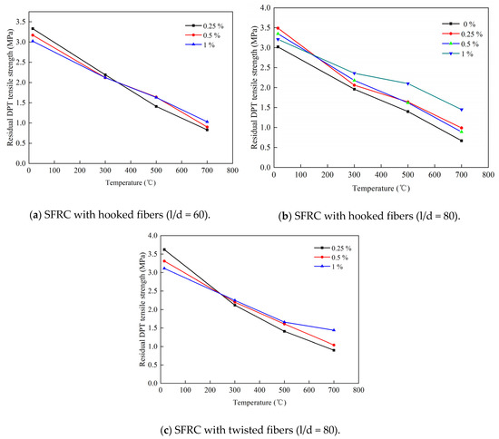 It has been discovered that the dosage, geometry type, and aspect ratio of steel fibers are main factors affecting the residual tensile strength of SFRC. According to the study of Gao et al. [28], as the content of steel fiber increased from 0% to 2%, the residual splitting tensile strength of ground granulated blast furnace slag concrete after being exposed to 400 °C increased correspondingly. However, in terms of the relative tensile strength, 1.0% steel fiber was the optimal amount of concrete. Zheng et al. [27] studied the relation between the relative tensile strength of reactive powder concrete and steel fiber content and discovered that the relative tensile strength increased as the steel fiber content increased from 1% to 3% when the temperature was below 600 °C; however, the relative tensile strength decreased at temperatures from 600 to 800 °C with an increase in steel fiber dosage. Kim et al. [63] investigated the effects of steel fibers of different aspect ratios (l/d = 60 or 80), geometry types (twisted or hooked), and volume content (0%, 0.25%, 0.5%, or 1%) on the residual tensile strength of specimens using double-impact tests when the specimens were exposed to 15 °C, 300 °C, 500 °C, and 700 °C. Figure 5 shows the effects of steel fiber types, the aspect ratio, and content on the residual tensile strength of concrete. As shown, the dosage and aspect ratio of steel fiber exerted a greater impact on the residual tensile strength of SFRC compared with its geometric type. At all test temperatures, the residual tensile strength of SFRC increased with the amount of steel fiber, regardless of its type and the aspect ratio. The residual tensile strength of SFRC was barely affected by the geometrical type of steel fiber, whereas the higher aspect ratio of steel fiber exerted a better effect on the tensile strength of SFRC.