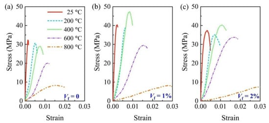 Stress–strain curves of SFRC exposed to different temperatures with steel fiber dosage of 0% (a), 1% (b) and 2% (c) [44].