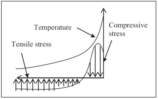 One is the accumulation of pore pressure in concrete because of the vaporization of the water inside concrete [13]. Concrete contains free water, chemically bound water in calcium hydroxide (CH) and interlayer water in C–S–H. Initially, the evaporation of free water began at approximately 100 °C, and the pore pressure of the matrix began to increase. When the temperature increased from 300 to 400 °C, the interlayer and chemical bound water of the C–S–H gel began to dehydrate. The calcium hydroxide began to dehydrate between 400 and 500 °C, causing the concrete to begin shrinking and the concrete’s strength to reduce significantly. Ultimately, the C–S–H gel would be decomposed entirely at a temperature of approximately 900 °C [83,84,85,86,87,88,89,90,91]. As the temperature increases, free water and chemical water in the pore structure of concrete evaporate, a portion of water evacuate to the heated concrete surface, and a large amount of water is vaporized and then migrated to the center of the concrete, where the vapor gathers and begins to condense because of the lower temperature of the inner part of the concrete. After a certain time period, a saturated layer begins to be formed inside the concrete, which prevents the vapor from moving toward the inner concrete. Instead, the vapor moves towards the surface of the concrete on a large scale to enter the atmosphere. The pore pressure in the porous network increases gradually, and the explosive spalling of concrete occurs when the tensile stress of the concrete fails to withstand the pore pressure [17,89]. Kalifa et al. [17] have confirmed the existence of a quasi-saturated layer precedes the drying front by measuring temperature field and the pore pressure of concrete. In addition, when the concrete is exposed to high temperatures, concrete with the lower permeability produces a saturated layer faster, the saturated layer closer to the heated surface, as well as the pore pressure and pressure gradient are higher. The entire process of concrete explosive spalling by pore vapor pressure is shown in Figure 10. The second reason is the cracking of concrete caused by thermal stresses arising from temperature gradients [13,26]. Under high temperatures or fires, the heating surface and the interior of concrete will form a thermal gradient, which is often referred to as “thermal shock”. When the surface temperature of concrete increases rapidly, concrete shrinkage occurs, and the compression stress generated is parallel to the surface of the heated concrete. In addition, tensile stress is generated in the concrete perpendicular to the surface of the heated concrete. The explosive spalling of concrete occurs once the compressive stress exceeds the tensile stress [92,93]. The mechanism of the thermal stress explosive spalling of concrete is shown in Figure 11. Furthermore, owing to the different behaviors of concrete components at elevated temperatures, the heterogeneity of concrete components will cause severe thermal cracking at the interface [94,95].